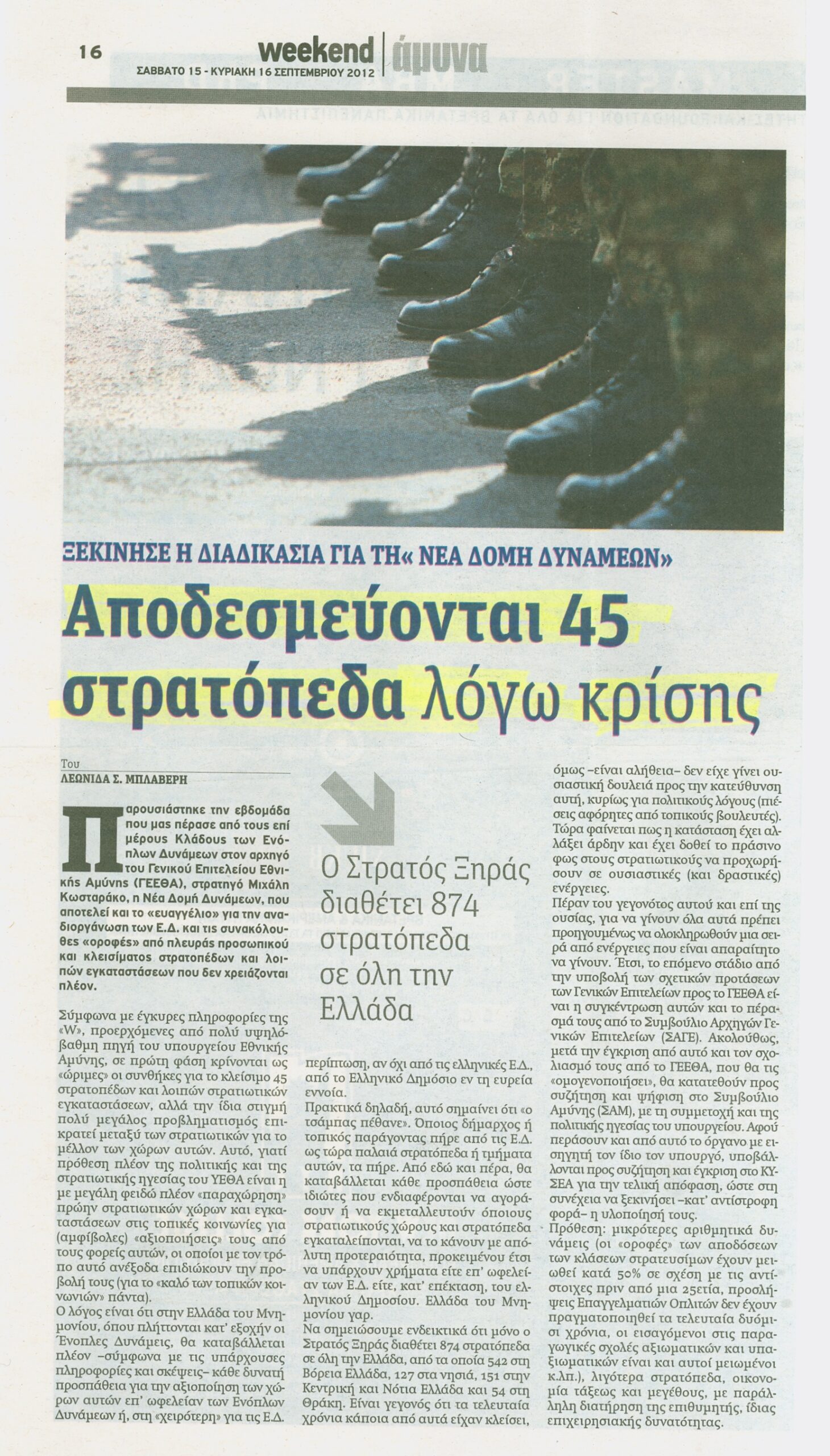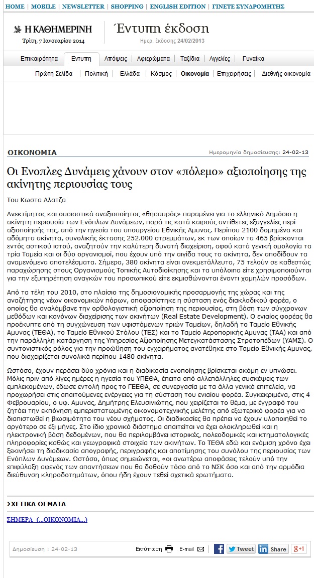 | Άρθρο της Καθημερινής για την αξιοποίηση της ακίνητης περιουσίας του στρατού | kathimerini.gr |  |