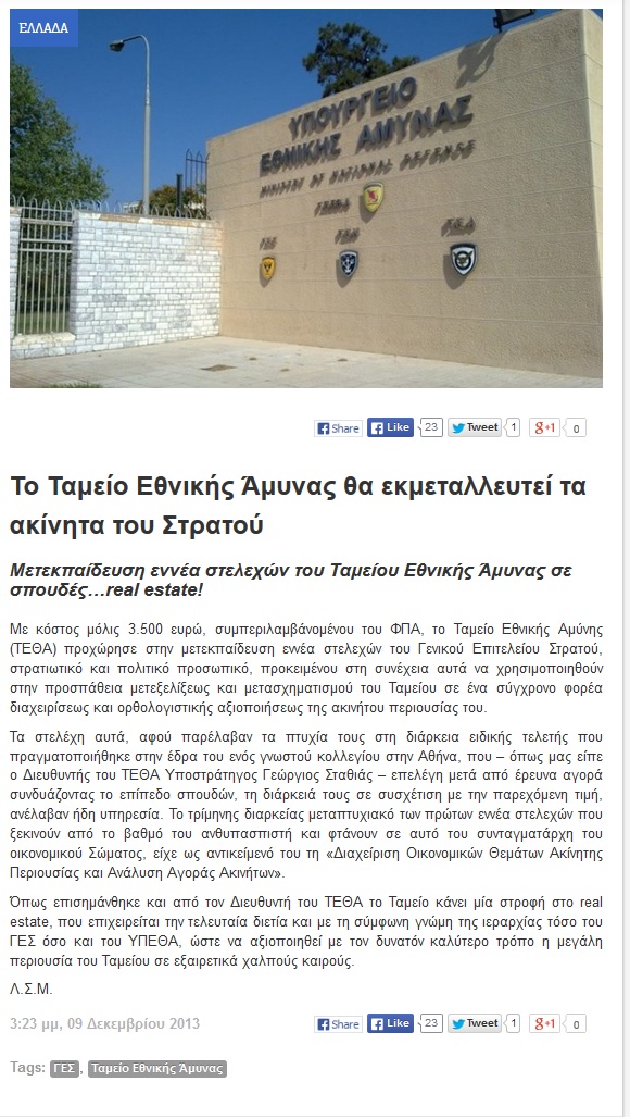| Το Ταμείο Εθνικής Άμυνας θα εκμεταλλευτεί τα ακίνητα του Στρατου. Μετεκπαίδευση εννέα στελεχών του Ταμείου Εθνικής Άμυνας σε σπουδές…real estate! | parapolitika.gr |  |